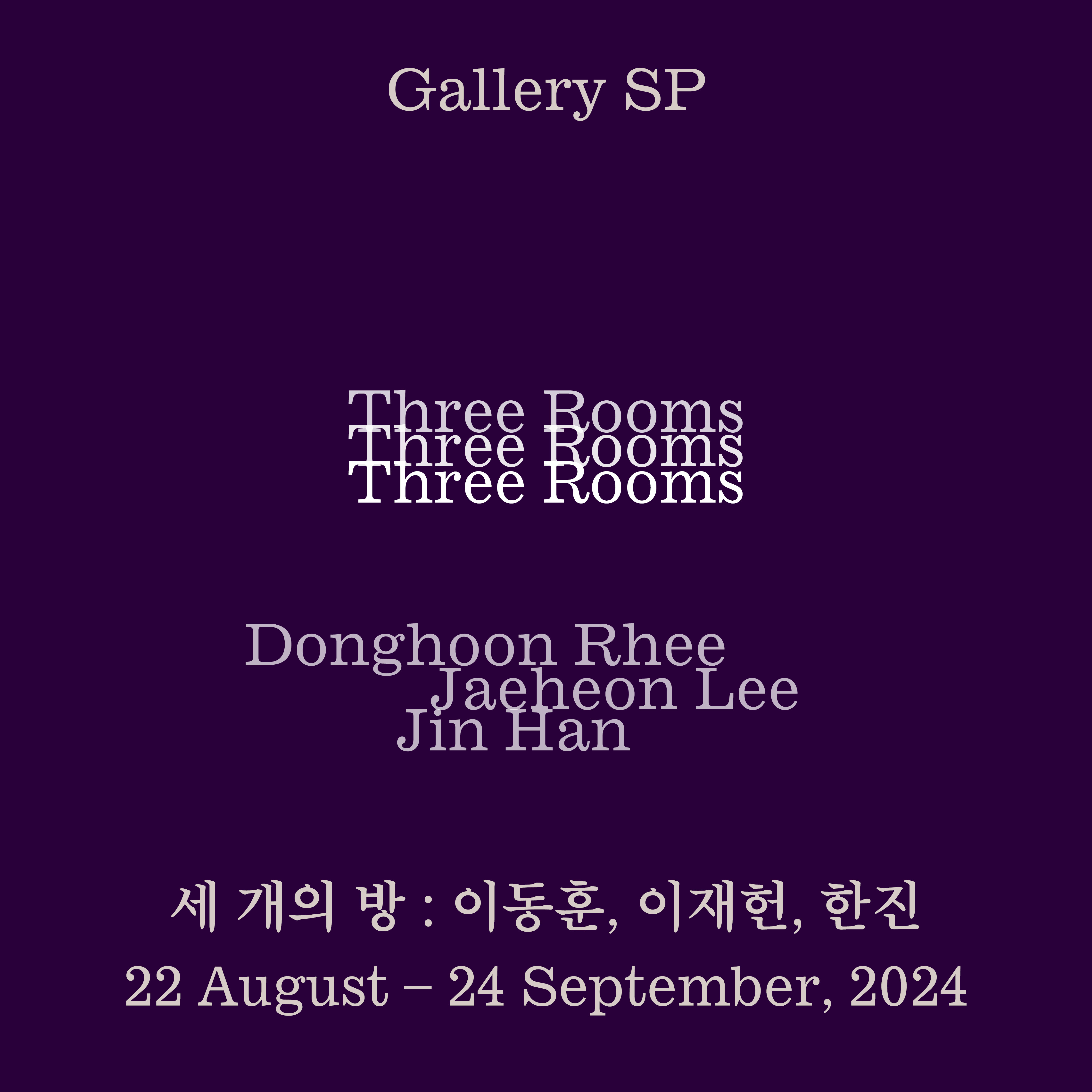 8월 22일(목)부터 9월 24일(화)까지 갤러리 SP는 이동훈, 이재헌, 한진으로 구성된 «세 개의 방 Three Rooms»을 개최한다. 전시는 화이트큐브(White Cube)로 리모델링되기 이전, 사택으로 쓰였던 전시 공간의 흔적을 되살려 불확실한 존재를 마주할 내밀한 공간으로 조성이 되었다. 방의 기능을 상실한 공적인 공간을 다시 ‘방’으로 호명한 전시장은 일상에 맞닥뜨렸던 작가들의 불가사의를 긴밀하게 대면할 임시 거주지로 제시된다. 결과로 드러나는 시각적 양상과 소재는 뚜렷하게 분리되지만, 세 명의 작가들은 공통으로 매체의 제한된 면적 속에 존재의 가벼움을 심층의 공간으로 담아내거나 변형하는 경향을 보여준다. 생물의 즉흥적 움직임을 타임라인으로 펼치는 대신 조각적 순간으로 담아내는 이동훈, 한 인물 안에 여러 타자의 얼굴을 중첩하고 지우므로 가늠할 수 없는 진공을 그려낸 이재헌, 그리고 어렴풋했던 존재의 흔적을 기억과 사료들에 의존하여 회화적 움직임으로 복귀시키는 한진, 이들은 우연히 목격한 찰나로부터 뚜렷하지 않은 존재의 본질을 손끝으로 짐작하고 표상하여 자신 안에 선명한 시공간으로 각인한다. 그러나 작가들의 뇌리에 남은 분명한 인상과 감성 이외에 흔적 없이 사라진 찰나는 완전하게 현현하지 못한다. 사진으로 기록해도, 혹은 비슷한 상황을 반복적으로 마주했을지라도 사건/존재는 정체가 작가들에게 밝혀지기 직전 눈앞에서 멀어져 버린다. 이들에 대한 명료한 근거와 관측이 미흡한 상황 속에서 작가들은 망막에 맺혔던 모습과 몸에 새겨진 기억에 따라 질료를 어루만진다. 회상 속의 막연한 모습과 현시에 구현되는 물질 사이에서 작가들은 사색과 비과학적 연구를 통해 언어로 통용되지 않았던 미시 형상을 명료한 현실로 발현한다. 그 현실은 존재의 원형이 아닌 작가와 존재 사이에서 접촉하고 멀어졌던 순간들이 시공간으로 구축된 이미지이자 형태다. 이처럼 작가들은 있었으나 없는 것처럼 여겨질 일상의 존재를 내밀하게 사유하고 반추상의 형상으로 공간 안에 안착하는 양상을 내비친다.